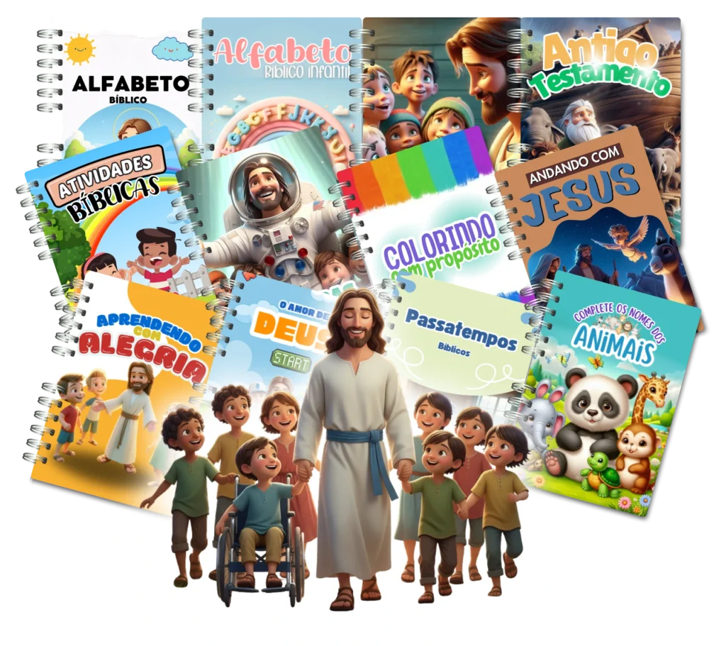 Um kit com 12 livros digitais cristãos, repletos de atividades, histórias e conteúdos bíblicos que fazem as crianças largarem a tela e mergulharem em aprendizado com propósito.